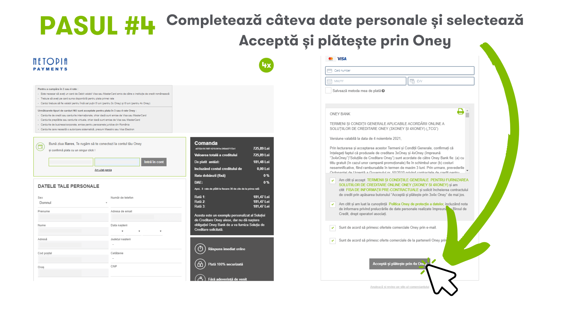 Pentru mai multe detalii, accesați următorul link : 3x 4x Oney | Oney (oney-bank.ro)